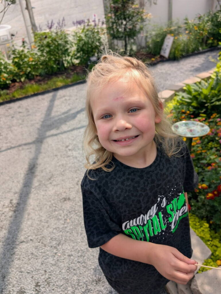 As scans continued, Audrey’s tumor grew. And grew again. Neuro-oncology became part of the team. Ophthalmology tracked her vision closely. Endocrinology was added as Audrey grew rapidly. Coordinating care meant driving into Chicago regularly, arranging childcare for Sterling, Audrey’s big brother, and leaning on supportive neighbors.
